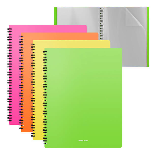 Папка файловая формата А4 из высококачественного пластика с текстурой поверхности «песок», на которой не видно отпечатков пальцев и мелких царапин. Предназначена для хранения и просмотра документов. Цвет папки — ассорти: зеленый, оранжевый, розовый, желтый. Папка содержит 40 прозрачных листов-карманов, надежно скрепленных двойной евроспиралью. Размер — 250х315х10мм, толщина — 0.6мм.